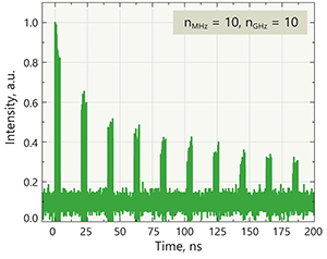 ・Short- and long-burst formation modes can be provided. A short burst is up to about 10 ns burst width (from 2 to tens of pulses in the GHz burst). A long burst is from ~20 ns up to a few hundred ns in burst width (from tens to thousands of pulses in the GHz burst)