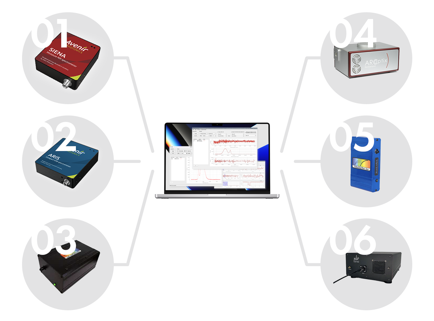 マルチプラットフォーム、マルチデバイス対応で複数メーカの分光器の同時制御と、構成ファイルの読込みおよび保存が可能です。また、多言語対応で使いやすく、タイムラプス分析や高速バースト取得を実現しました。