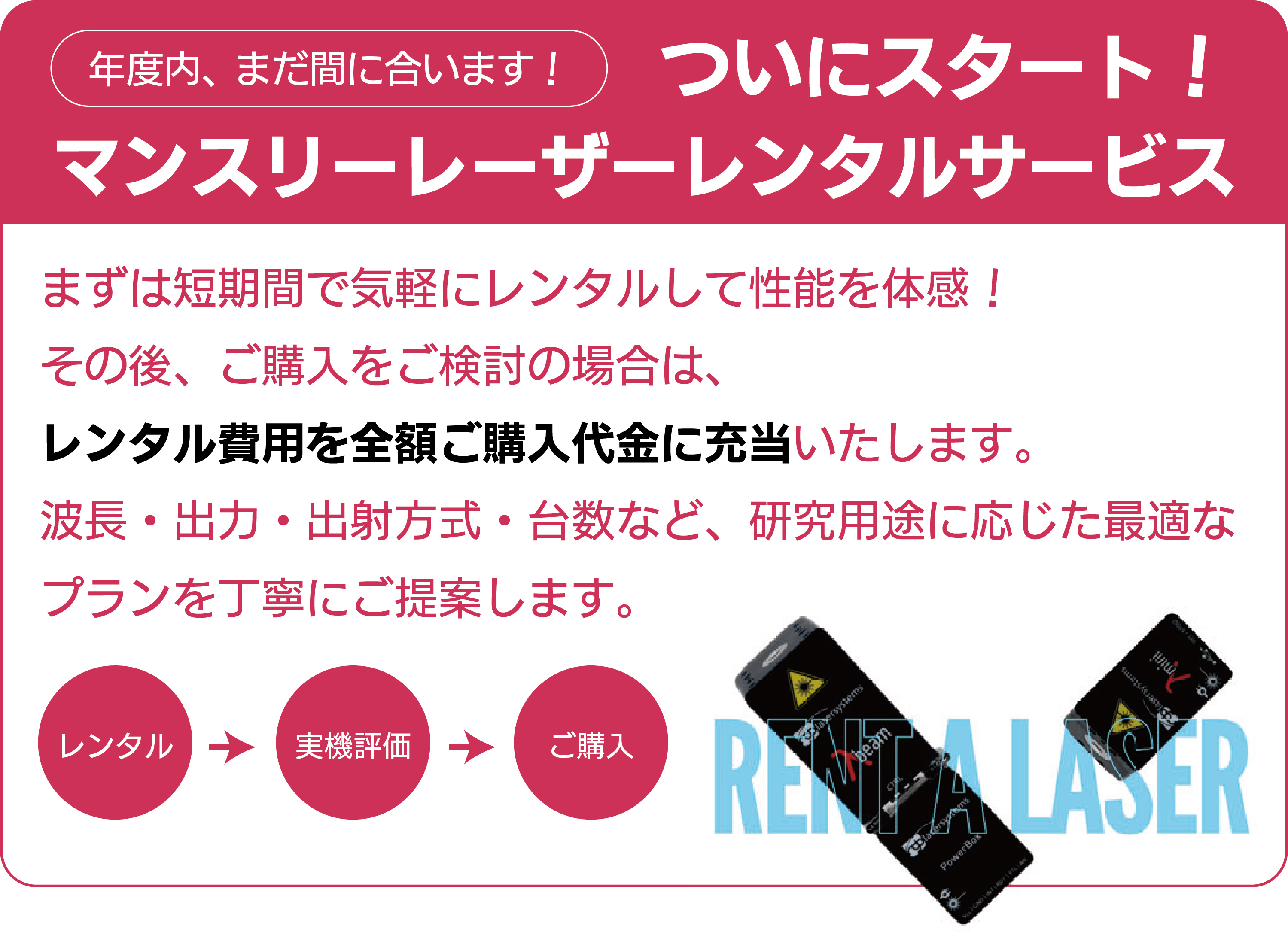 本サービスは、RGB Lasersystems GmbH社より販売中の各小型レーザーを、短期間で気軽に性能を体感いただける、当社が世界に先駆けて始めたレンタルサービスです。