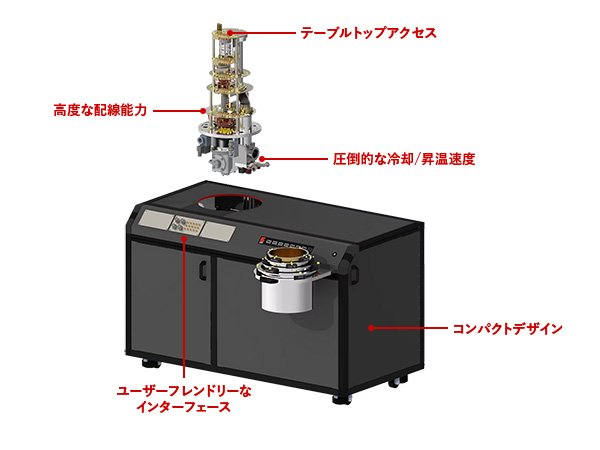 「Quper」は、量⼦ビットの迅速なテストと評価を⽬的に設計された、⾼速ターンアラウンドを誇る倒立型⼩型冷凍機です。